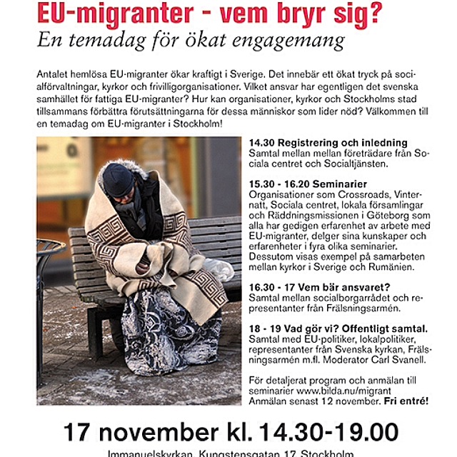 Antalet hemlösa EU-migranter ökar kraftigt i Sverige. Det innebär ett ökat tryck på socialförvaltning, kyrkor och frivilligorganisationer. Vilket ansvar har egentligen det svenska samhället för fattiga EU-migranter? Hur kan organisationer, kyrkor och Stockholms stad tillsammans förbättra förutsättningarna för dessa människor som lider nöd? Välkomna till en temadag om EU-migranter i Stockholm.
